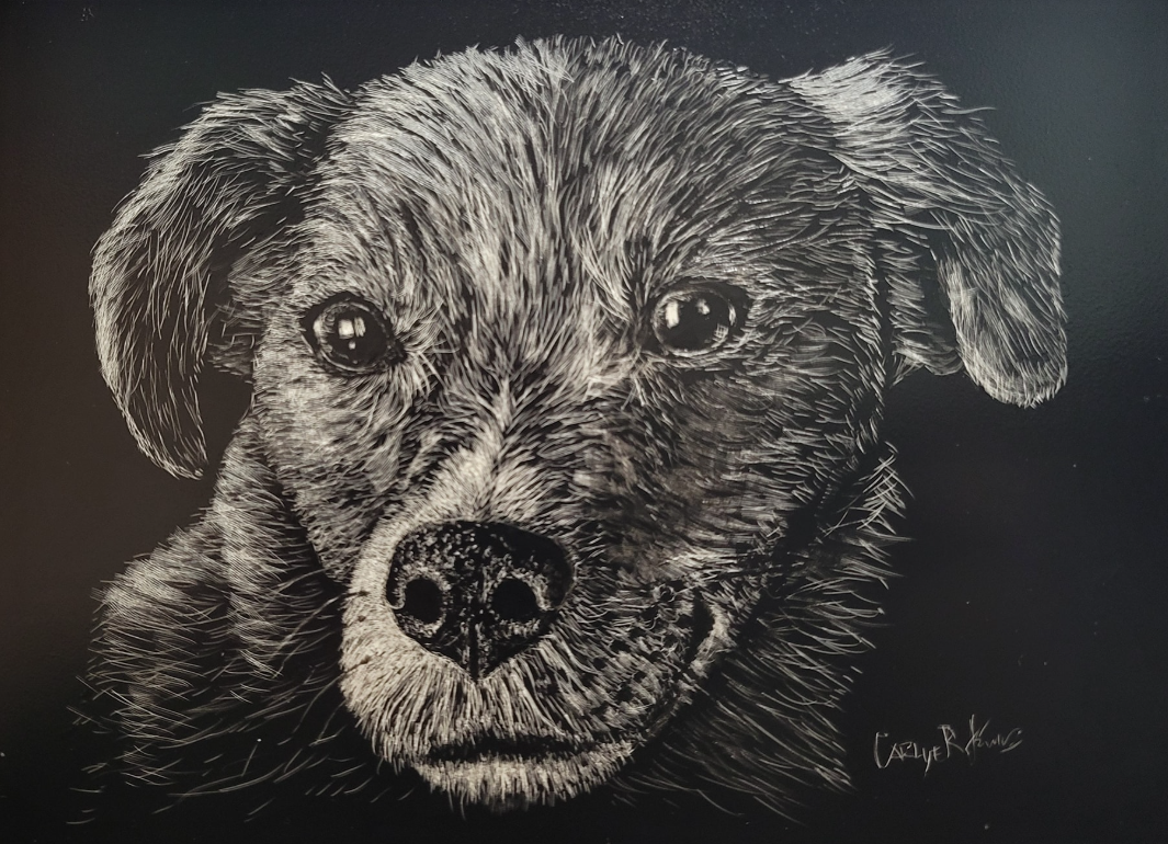 Includes: 1 black and white etching of 1 pet’s face on scratchboard